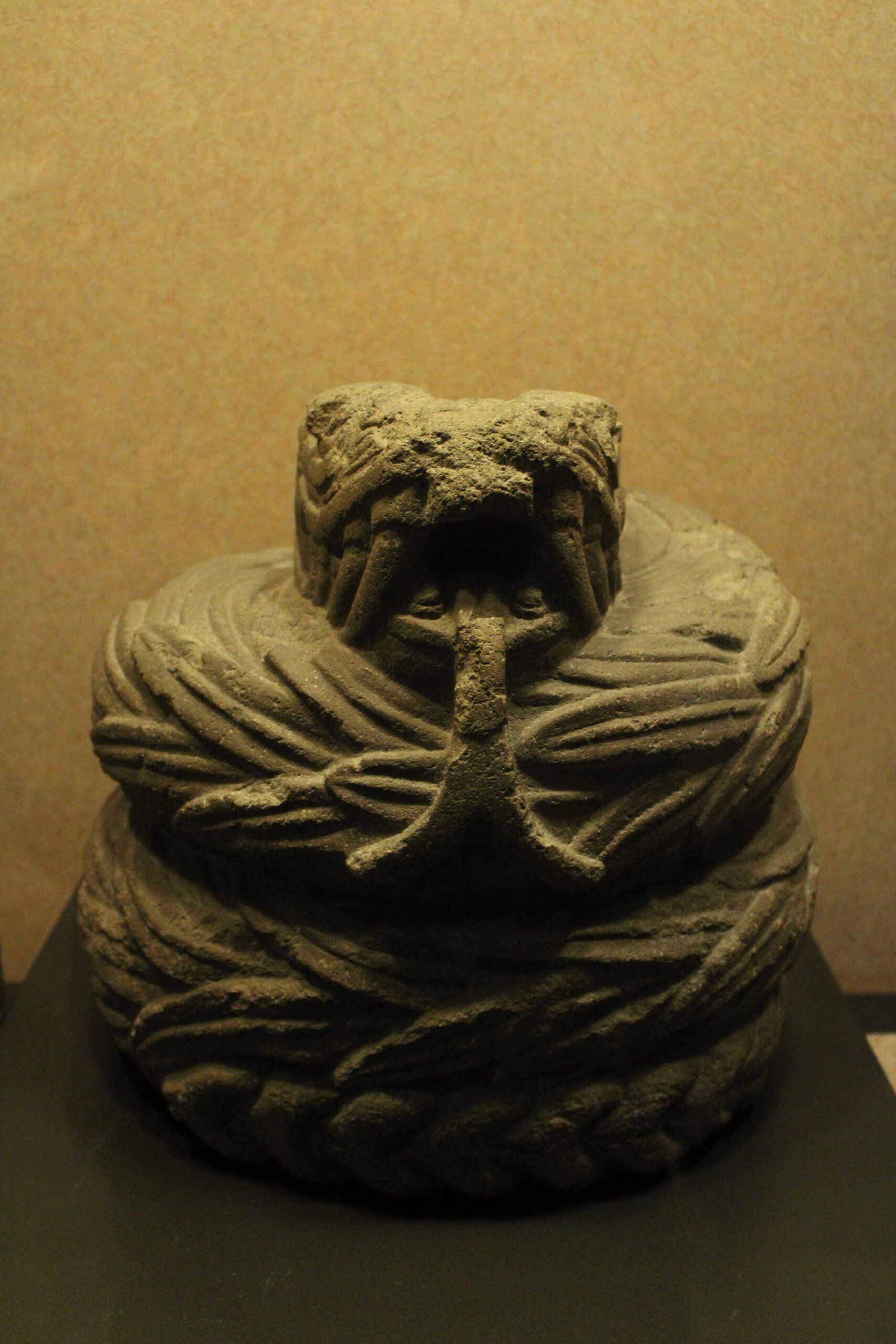 Quetzalcóatl fue representado por los escultores mexicas, mediante estas poderosas imágenes de serpientes que visten las plumas preciosas que distinguen a la deidad; ellas abren sus fauces mostrando sus fuertes colmillos y la lengua bífida, que distinguen a este feroz animal