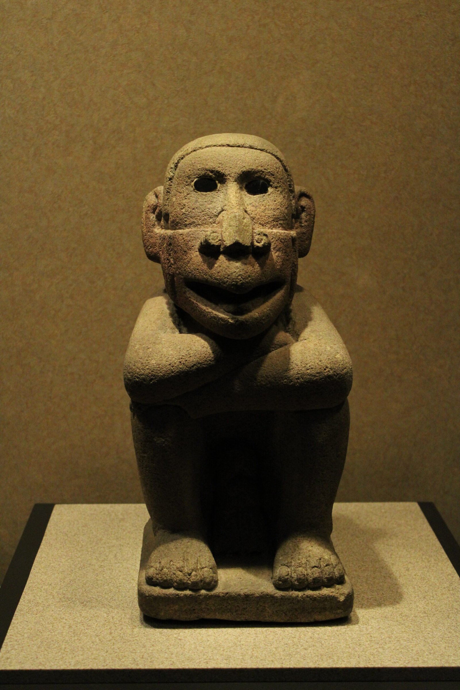 Este personaje sedente presenta incrustaciones de obsidiana que simulan sus ojos; muestra además, la media máscara de pico de ave, uno de los atributos asociados a Quetzalcóatl, en su advocación de dios del viento, cuyo nombre es Ehécatl,