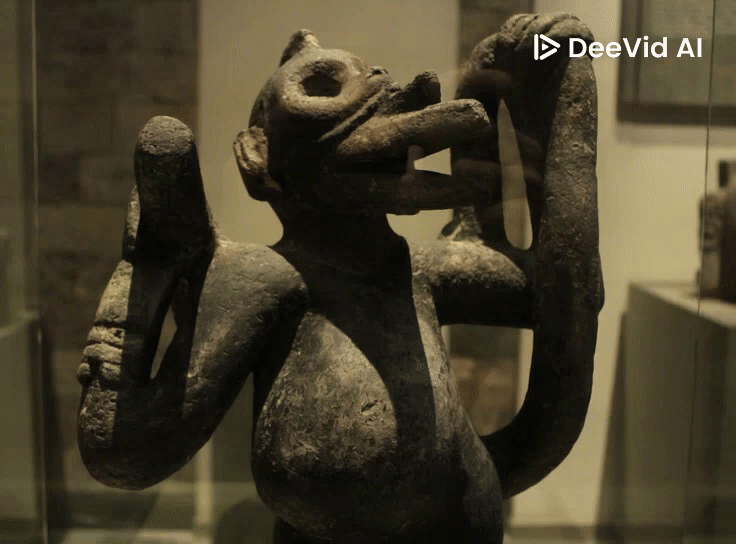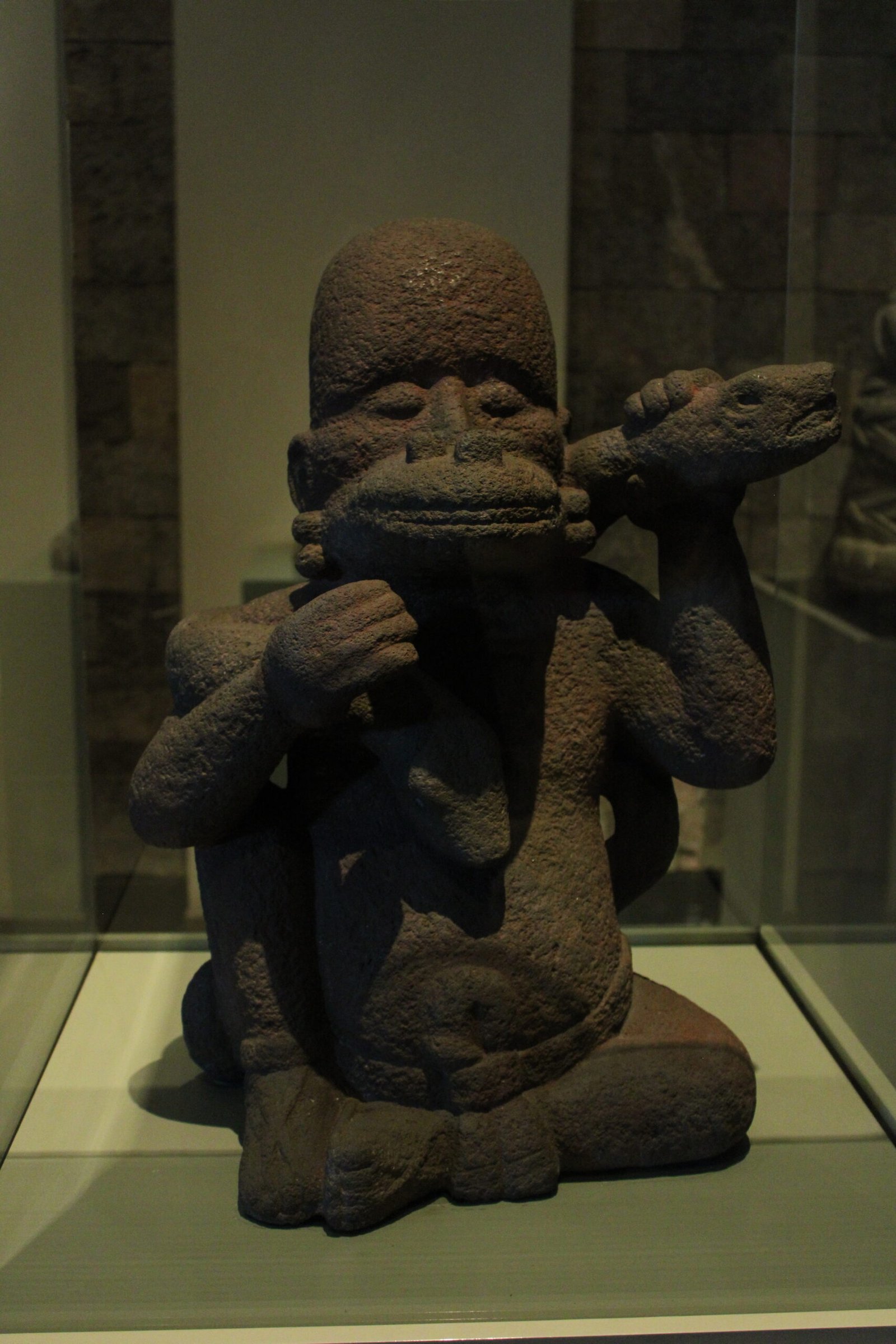 El mono araña representado en esta figura, porta una máscara bucal en forma de pico de ave que lo relaciona con el culto religioso de Ehécatl-Quetzalcóatl, el dios del viento. El animal, de vientre abultado, se muestra sosteniendo su cola en forma de serpiente que lleva el mismo pico y con los pies cruzados que le dan un movimiento helicoidal al cuerpo, como representación de un remolino de viento.